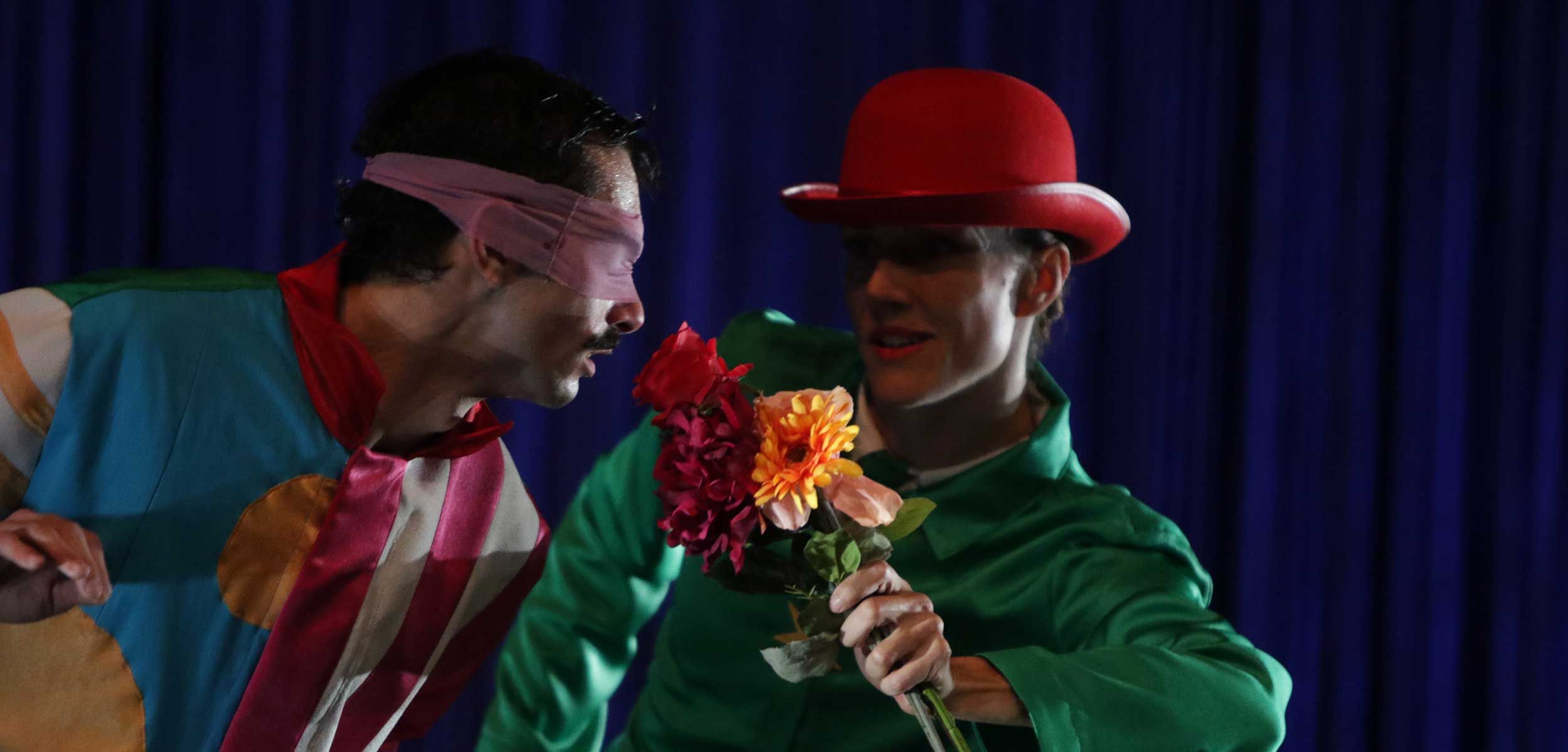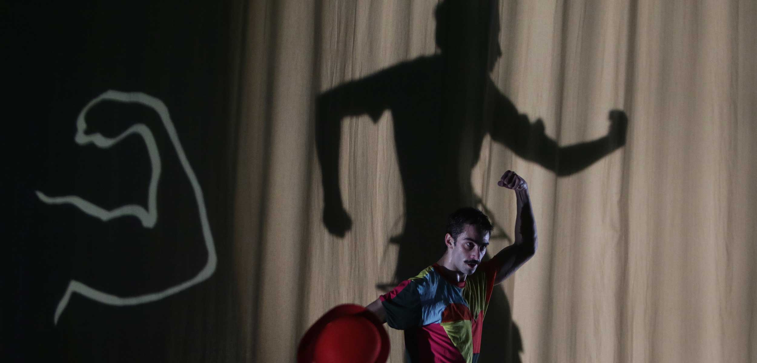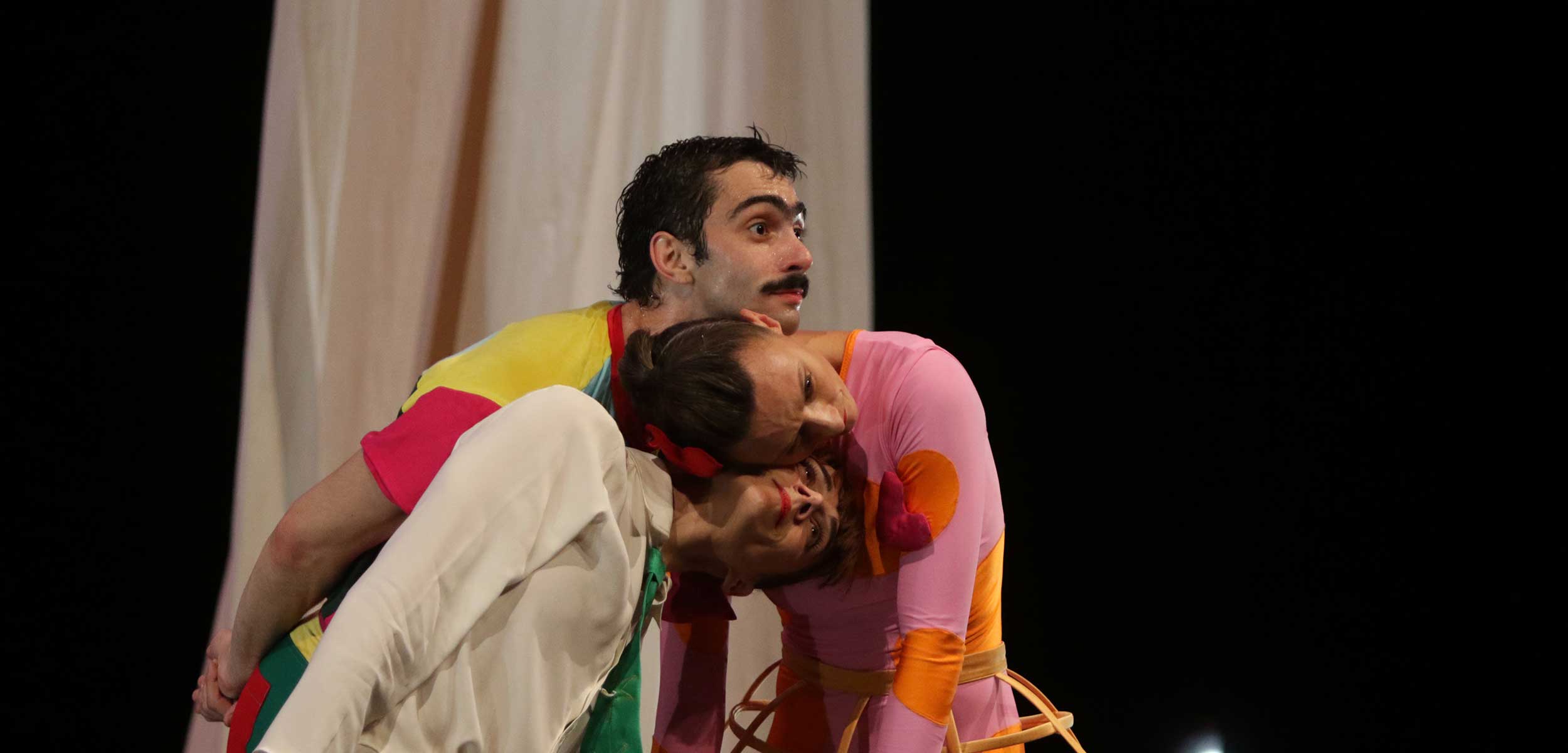 Dans des costumes aux couleurs vives, les silhouettes des protagonistes jouent avec un immense rideau blanc. Elles se cachent, s’allongent tout en ombre et en muscle, se hasardent avec humour et fantaisie.