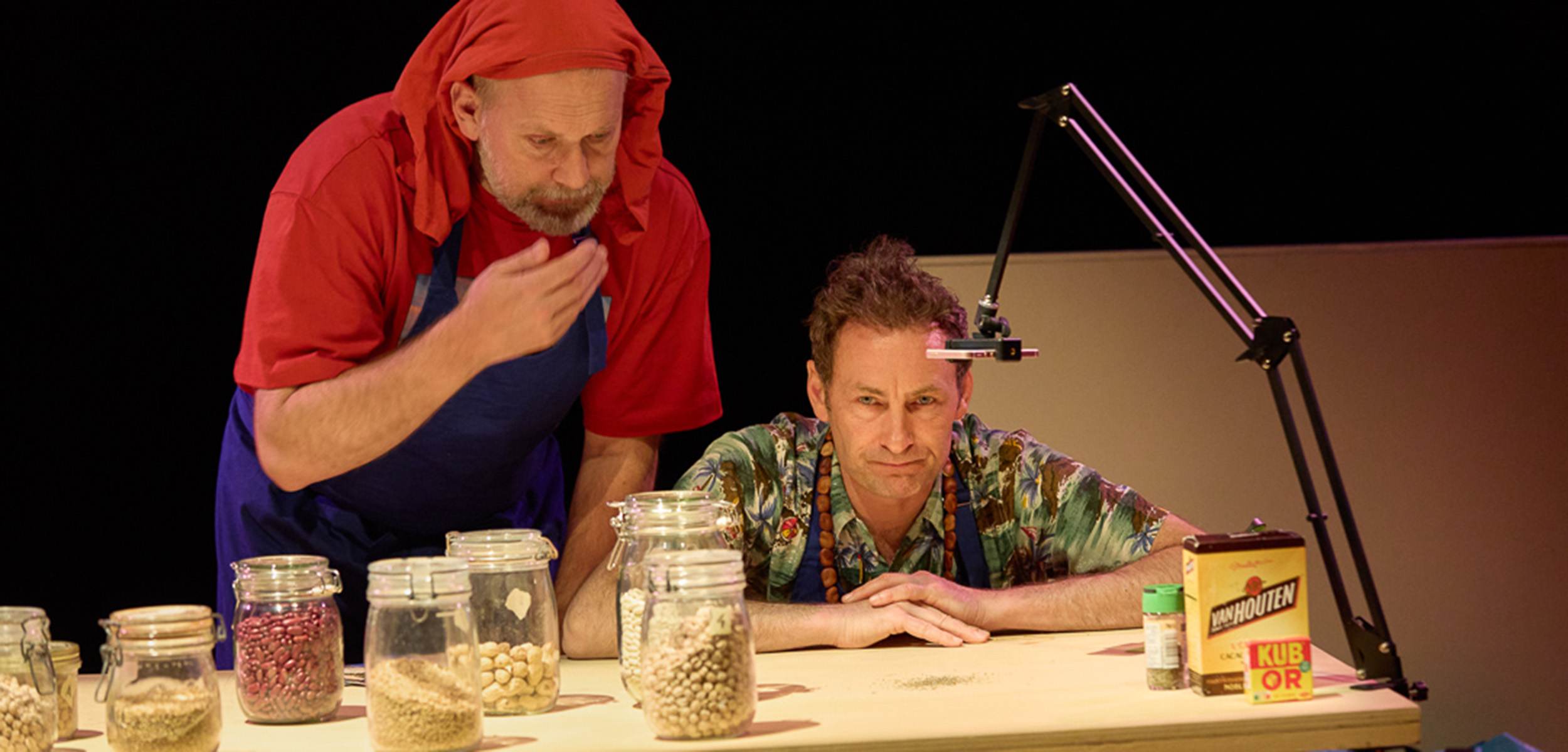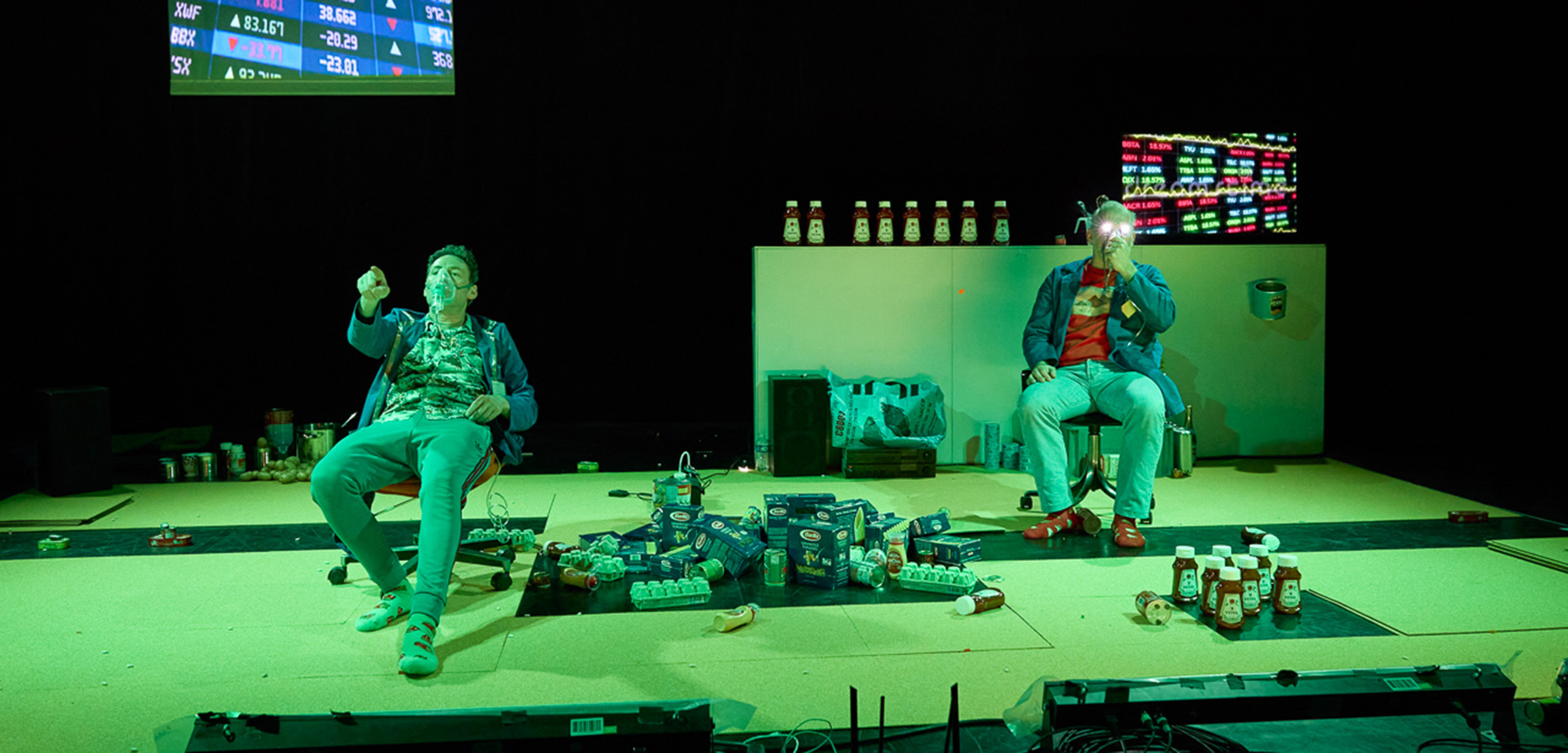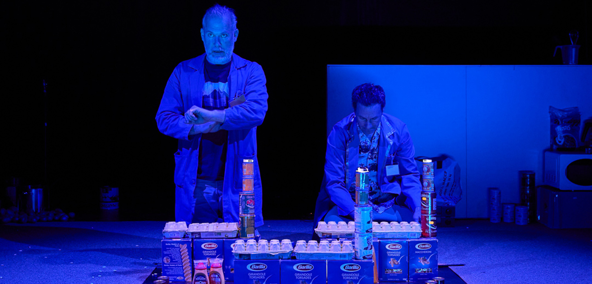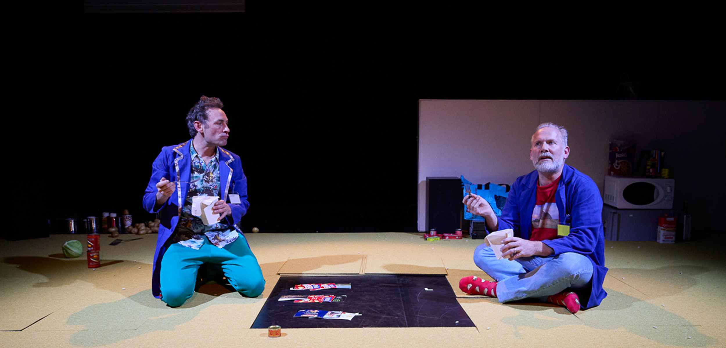 Deux apprentis anthropologues nous reçoivent dans leur cuisine où ils nous racontent à l’aide d’un jeu de société, inventé pour l’occasion, l’histoire de l’argent. Soit 5000 ans d’échanges commerciaux, de montages économiques et de dettes mis en scène avec les aliments qui leur servent à préparer un repas… Carottes, farfalles et haricots secs sont les acteurs de cette épopée économique. Le sel se fait désert aride, les boîtes de pâtes supermarché. Un théâtre d’objet parfois amplifié par caméras et vidéoprojecteur. Puis petit à petit la table est renversée, les vieux légumes laissent la place aux denrées de l’agro-industrie, les emballages racontent…