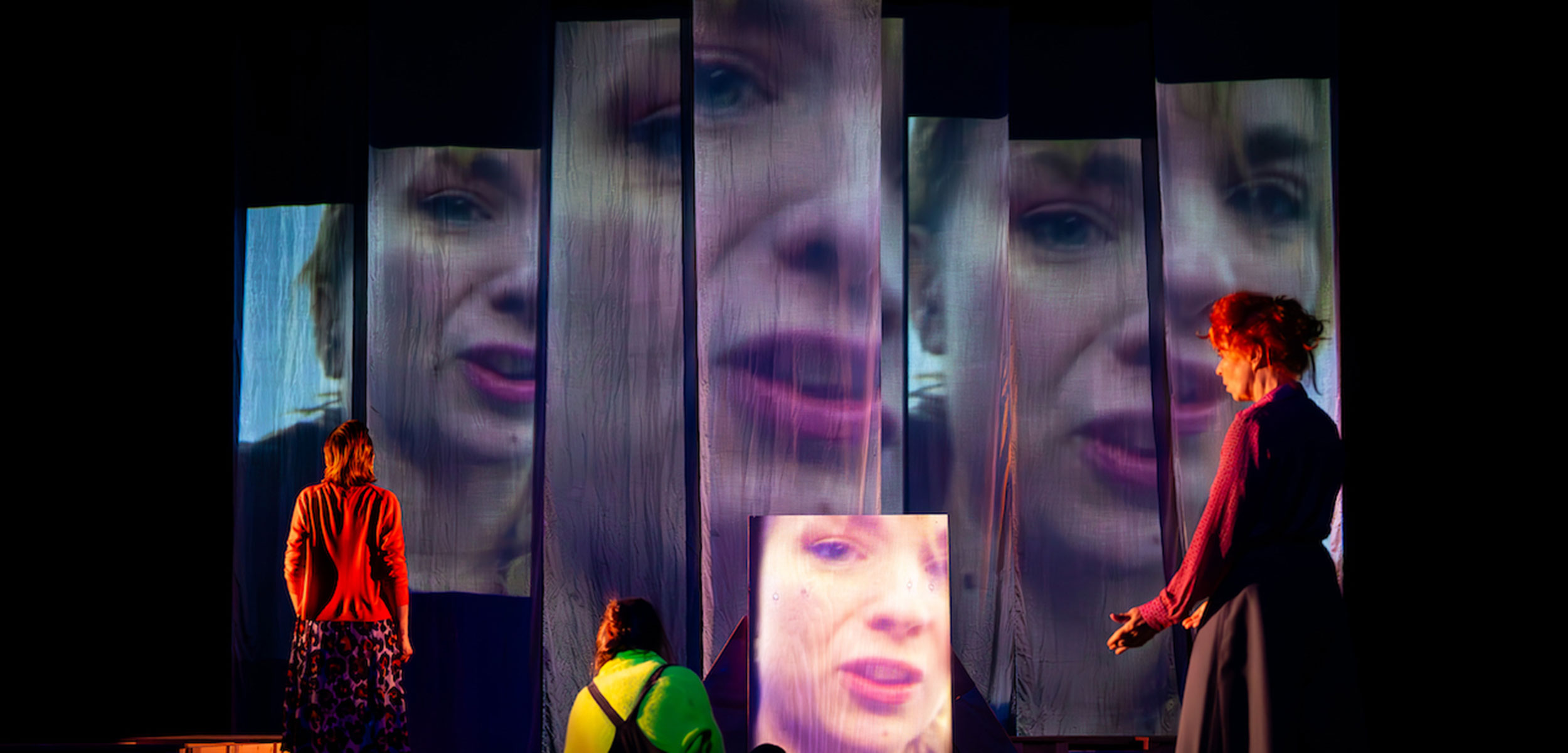 Sur scène, un dispositif tel un duplex télévisé permet des allers-retours entre les réactions des personnages et des scènes extérieures filmées en direct à la recherche de la vérité. Le public suit les deux endroits en même temps.