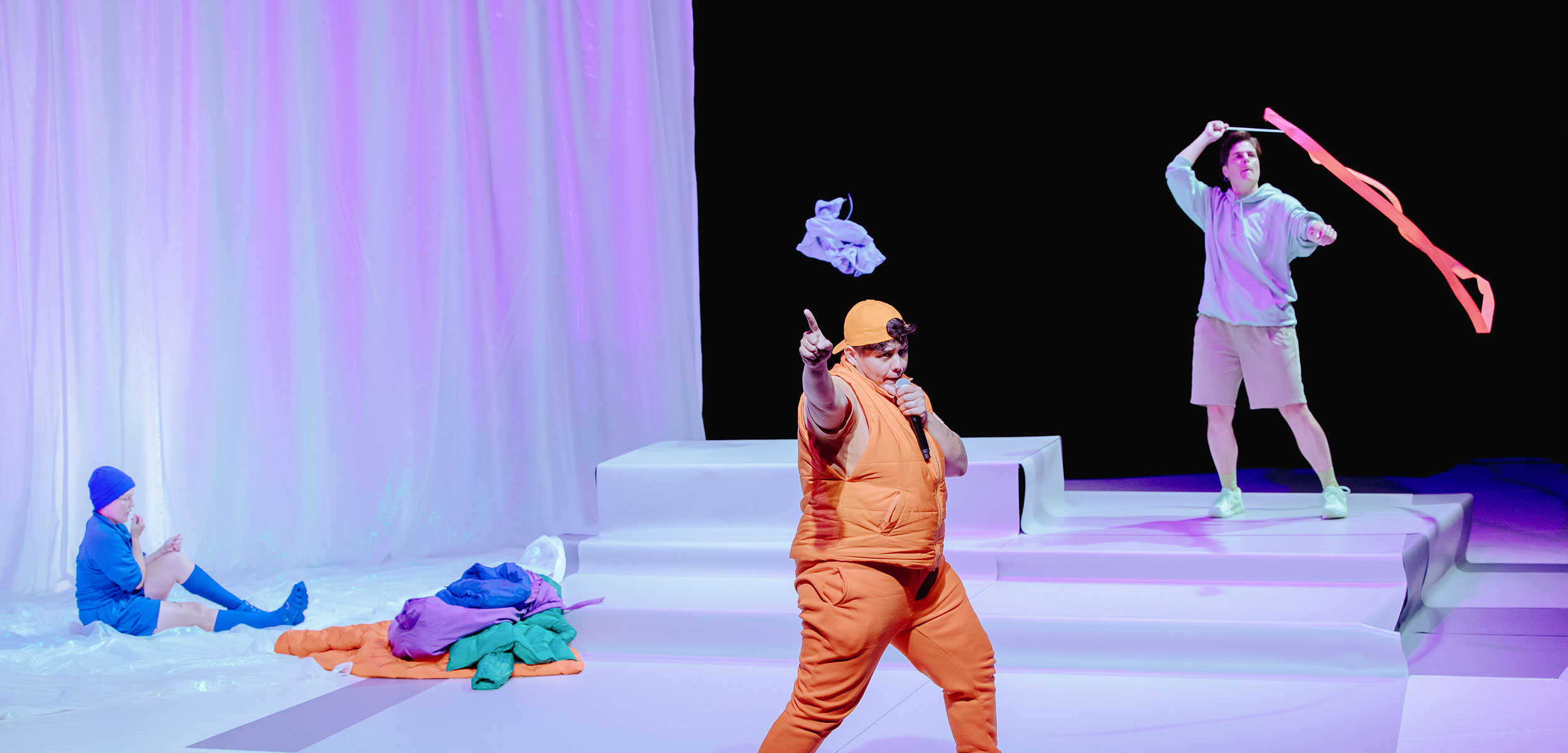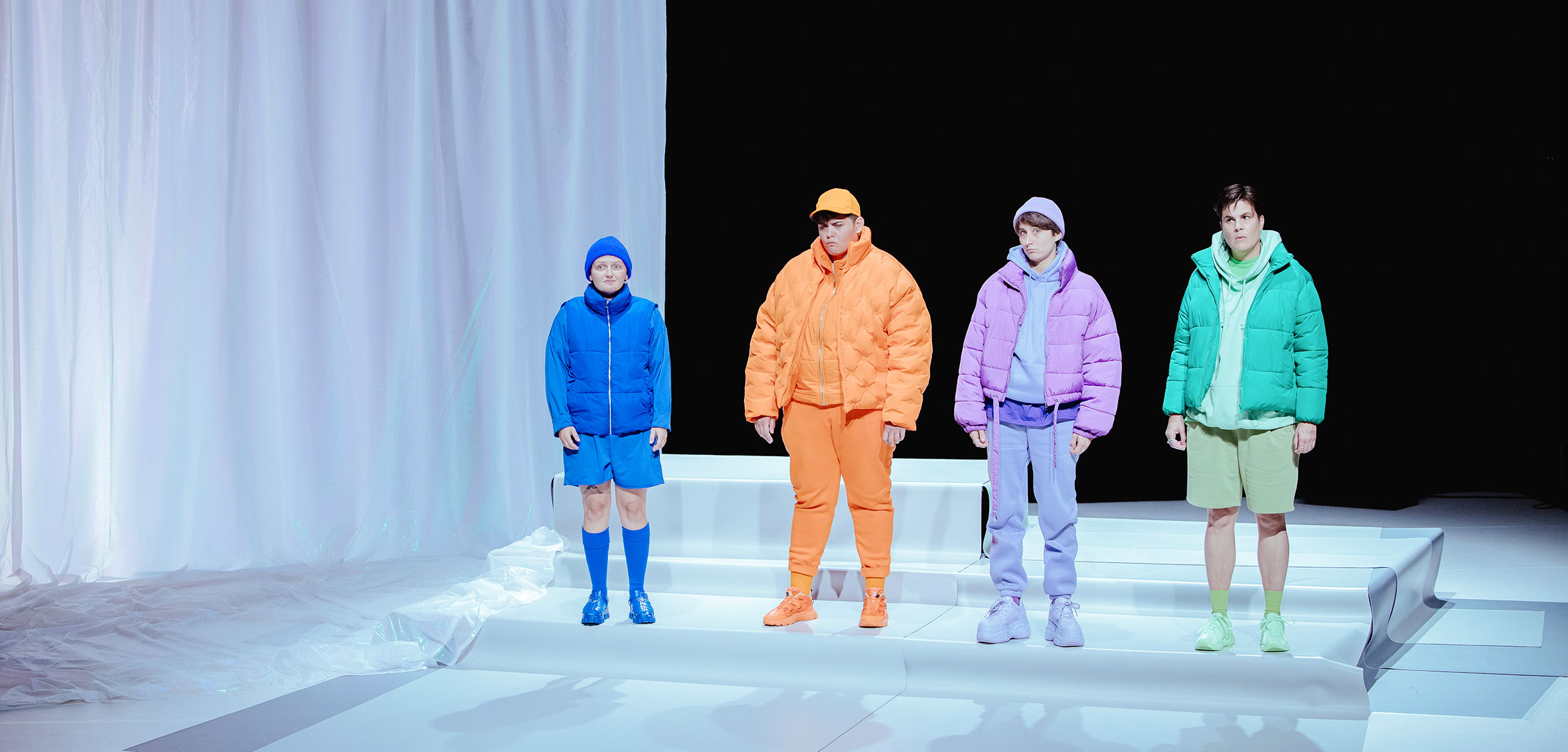 La scénographie très graphique, d’un blanc irisé permet à chaque corps, chaque silhouette de se déployer dans sa couleur, son caractère, comme pour s’affirmer aux yeux du monde.