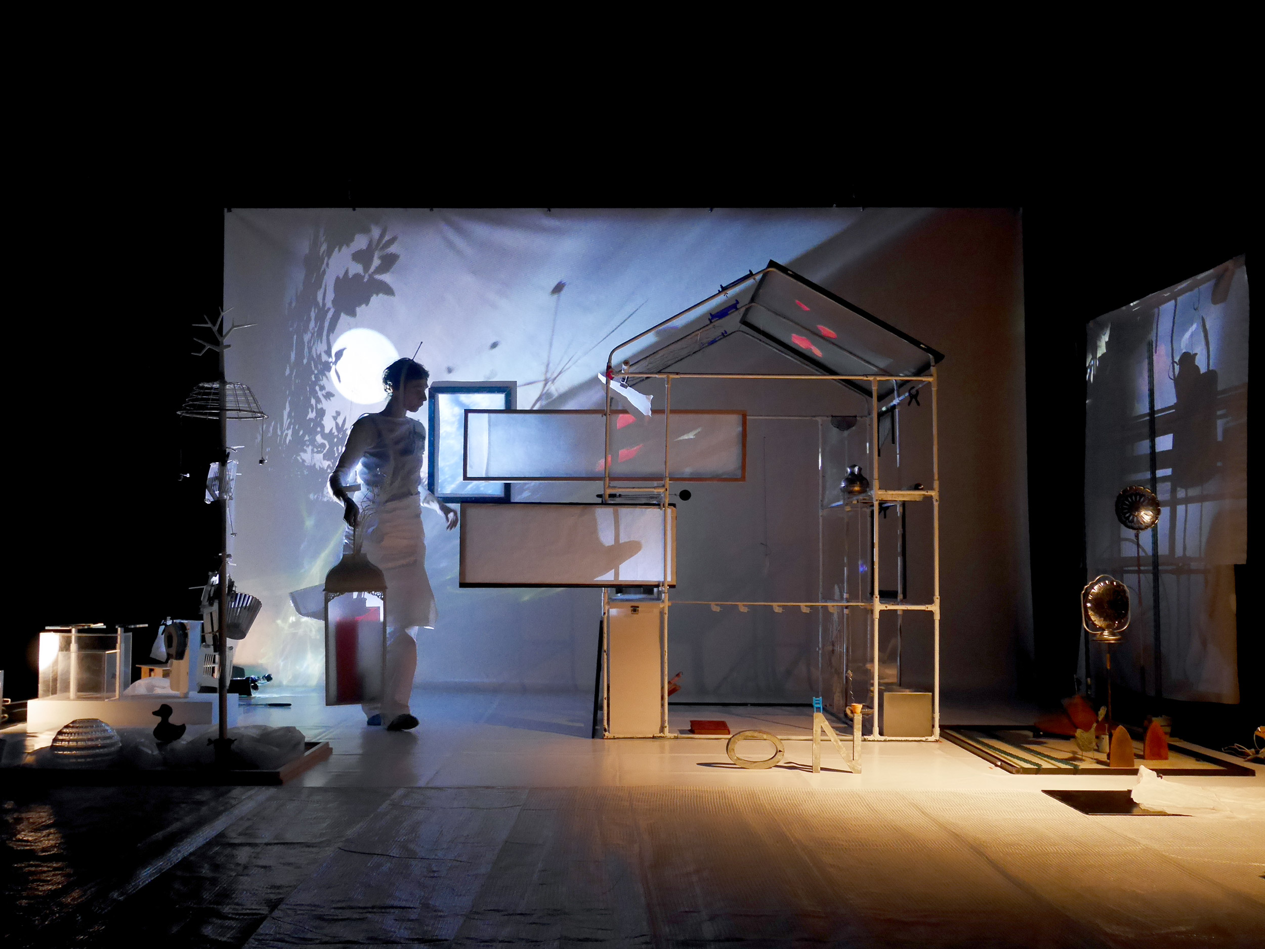 Grâce à une scénographie mobile et sonore, le paysage se transforme en mélodie. La maison légère danse des bribes de ses mémoires. Les images accompagnent ce carnet de voyage en trois dimensions. Les images, les sons et les objets assemblent un espace onirique pour une promenade insolite dans nos propres mémoires et sensations. Un poème en mouvement, hommage aux cinq sens pour les petits et les plus grands.
