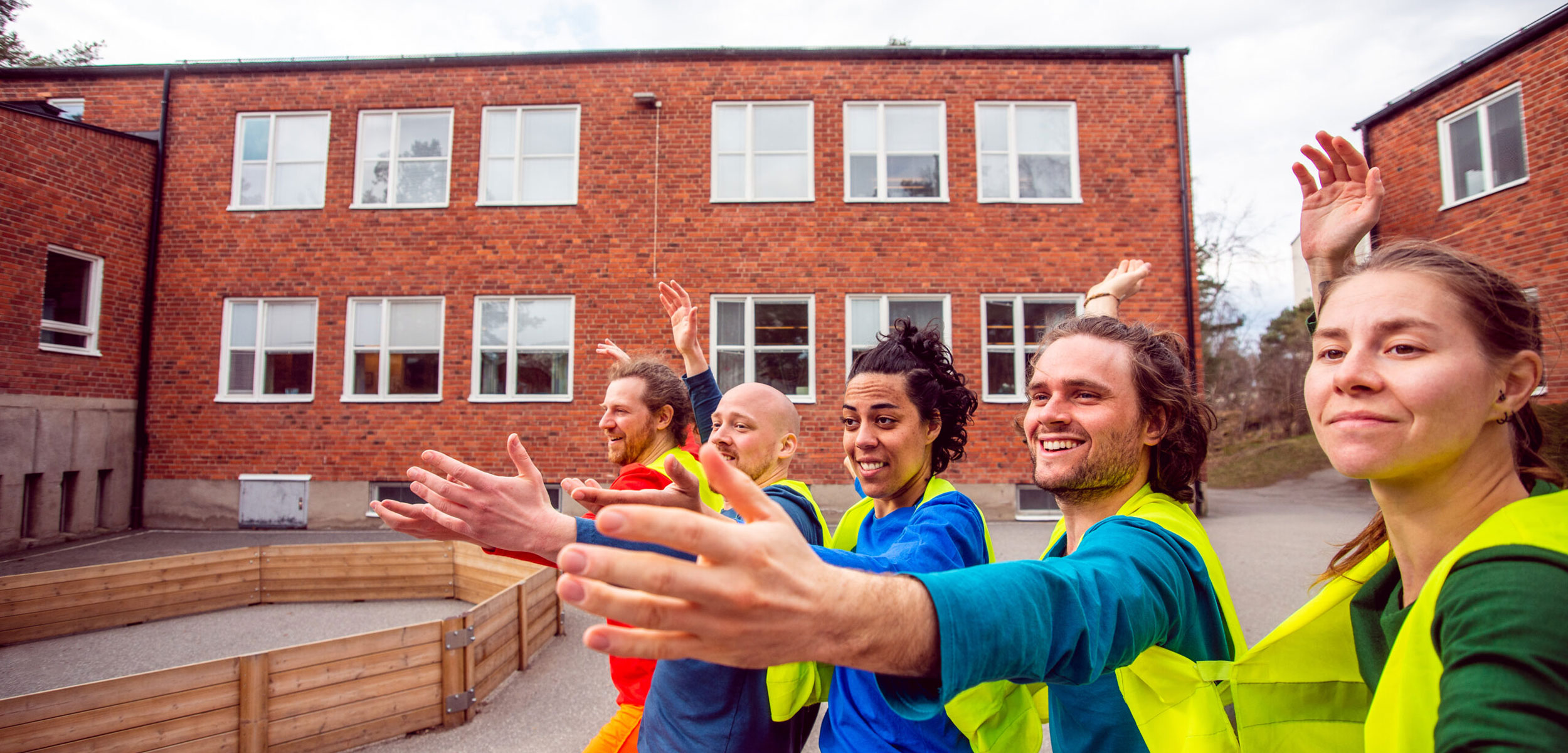 Dans l’espace public, spectateurs et spectatrices se rassemblent. L’enthousiasme se propage. Tout le monde est là pour s’amuser, tout le monde s’engage à vivre une expérience unique. À quoi s’attendre ? Quelles sont les règles ? Est-ce sans danger ? Ce qui pourrait être un chaos total est en fait une situation très organisée et chorégraphiée. Au milieu du groupe des personnes vêtues de gilets jaunes fluo sont détentrices du savoir et de l’organisation. Elles savent où tout se trouve et quand tout se passe. Elles sont là pour aider, même si elles sont perchées sur les épaules de quelqu’un ou si elles dansent à en perdre haleine.