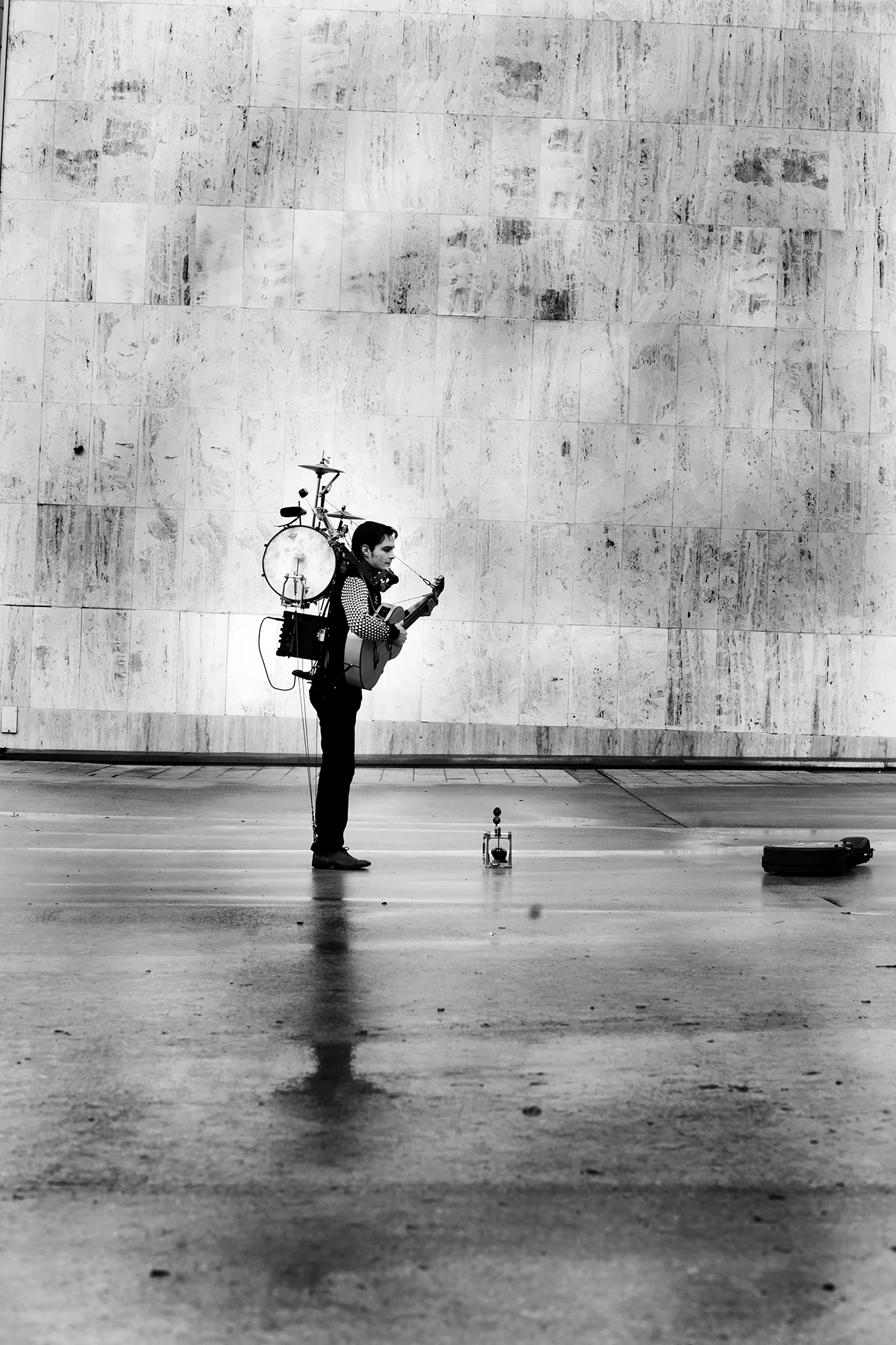 Guitare amplifiée, voix, percussions, harmonica, kazou, sonnette de comptoir, 7 commandes dissociées actionnent une machinerie d’une quinzaine d’éléments. Par un réseau de fils et de poulies, le corps de l’artiste est relié à un instrumentarium qu’il porte sur le dos. Avec une dextérité fascinante, ce virtuose joue une partition rythmée aux influences sud-américaines. Cette performance musicale et physique est une exploration autour du son en direct, du mouvement et de la coordination du corps.