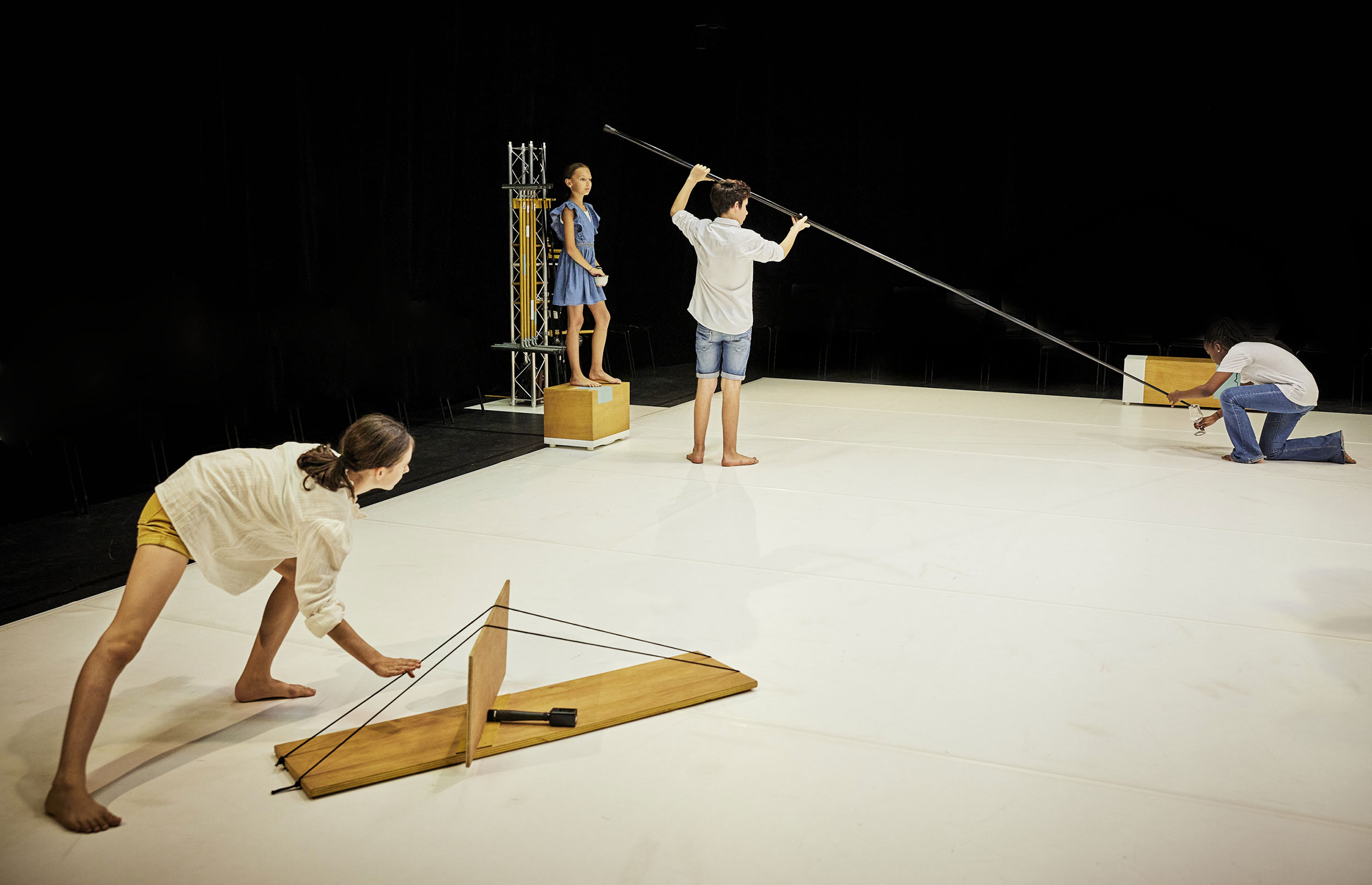 Les spectateur·trices sont accueilli·es sur l’ensemble du pourtour d’un carré évoquant une « lutherie en construction ». Un espace modulé, habité par des enfants énergiques et joueur·ses, à l’écoute d’eux·elles-mêmes, des autres et des sons produits.