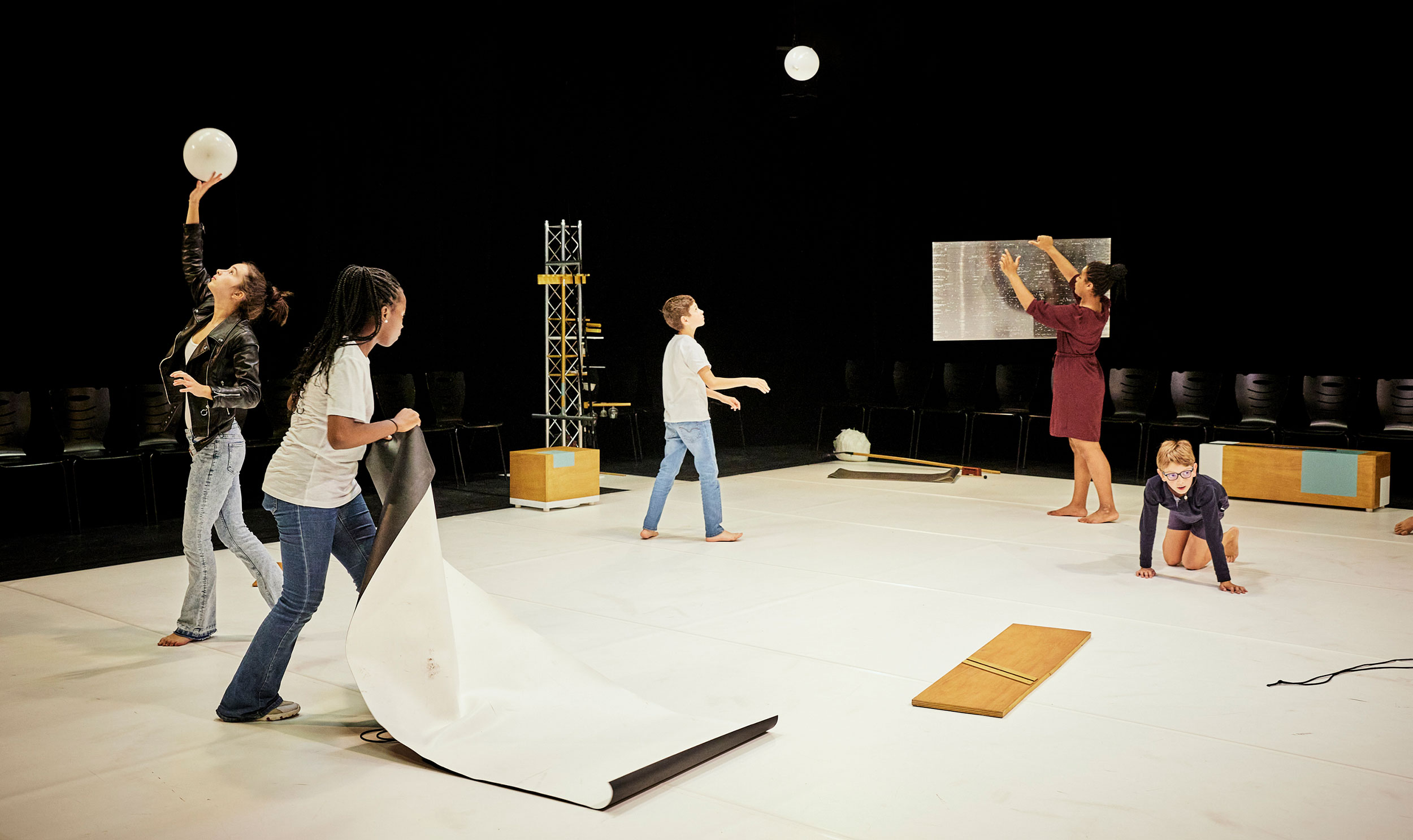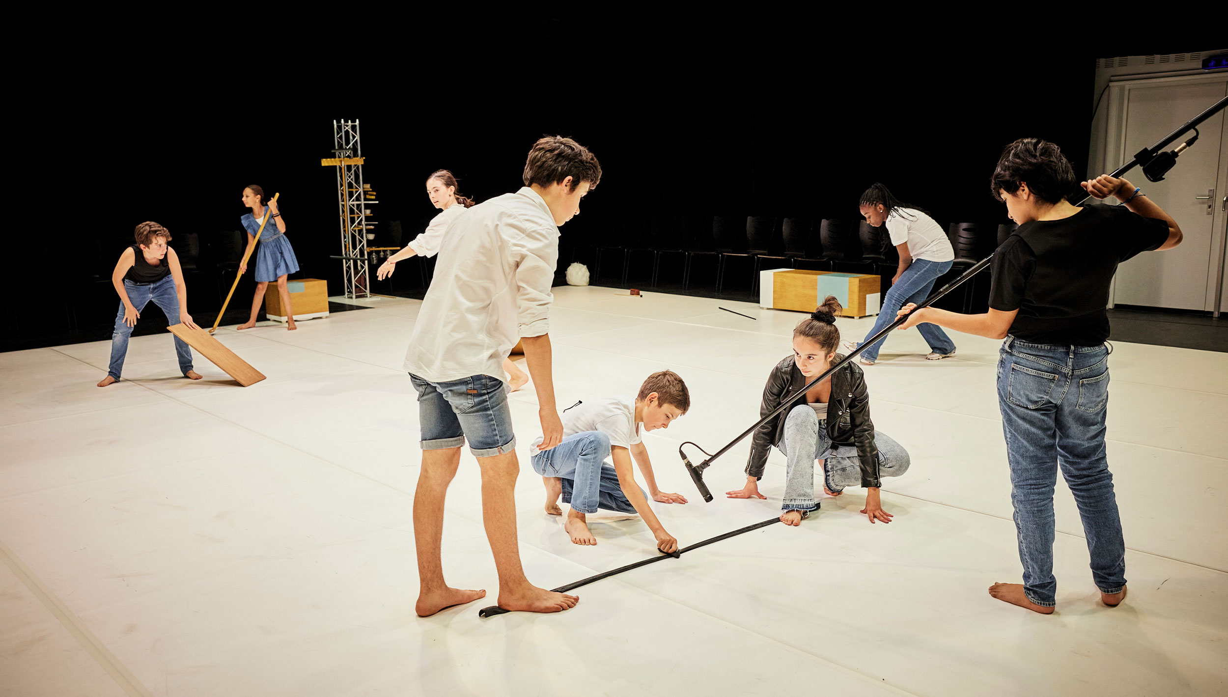 Marelle / may bodies modulate! is a proposition in which the children become both the ballet dancers and the musicians of the project. They are as much the performers as they are the orchestra that interprets the score. This concept is based on a design in which each movement triggers the production of a sound, like a musical hopscotch (“marelle”). This design, which is at once scenic, instrumental and technological, also has acoustic, plastic and poetic implications. It is an orchestra of objects and materials, the manipulation of which implies a strong physical and gestural dimension. The space is thus envisaged as a “luthier’s workshop under construction”, transformed and inhabited by energetic and playful children who listen to the sounds they produce and to the sounds produced by others. The production takes the form of a danced concert. An abstract artistic gesture, free of narration, but full of interaction, fantasy and of the joy of play. A moment in which listening to music and listening to the sound of the body become one, in which instrumental technique and choreographic intention become inseparable. Marelle / may bodies modulate! is redesigned each time. The project was conceived as being of an open format, meaning it can be divided into its component parts and adapted to the spaces in which it is performed. It thus aims to capitalise on the strengths offered by each environment.