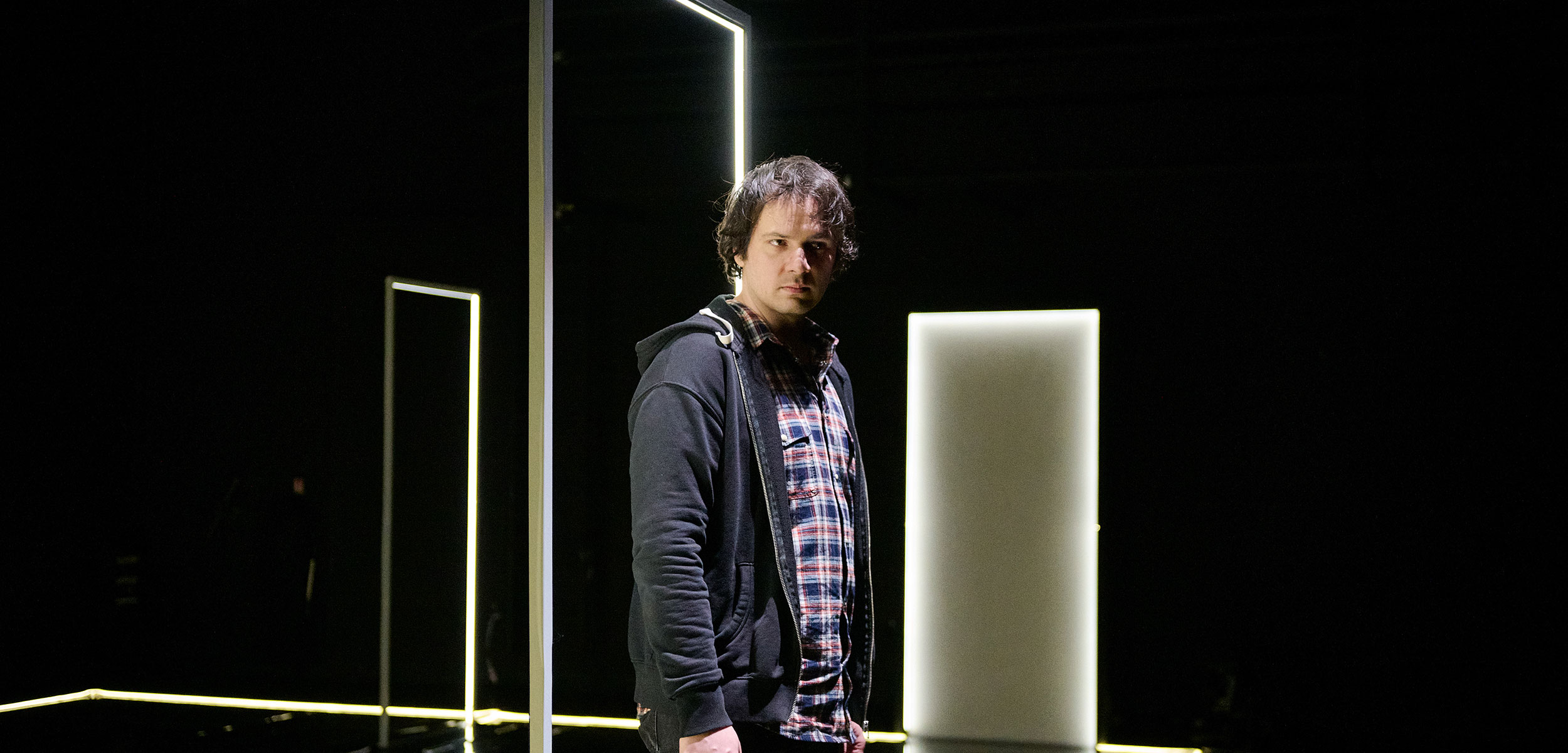 Dans un décor minimaliste, L’Amin Théâtre esquisse le contour des portes et les pièces de la maison par des lignes blanches. Chacune, chacun, pouvant ainsi transposer l’histoire dans sa propre maison.