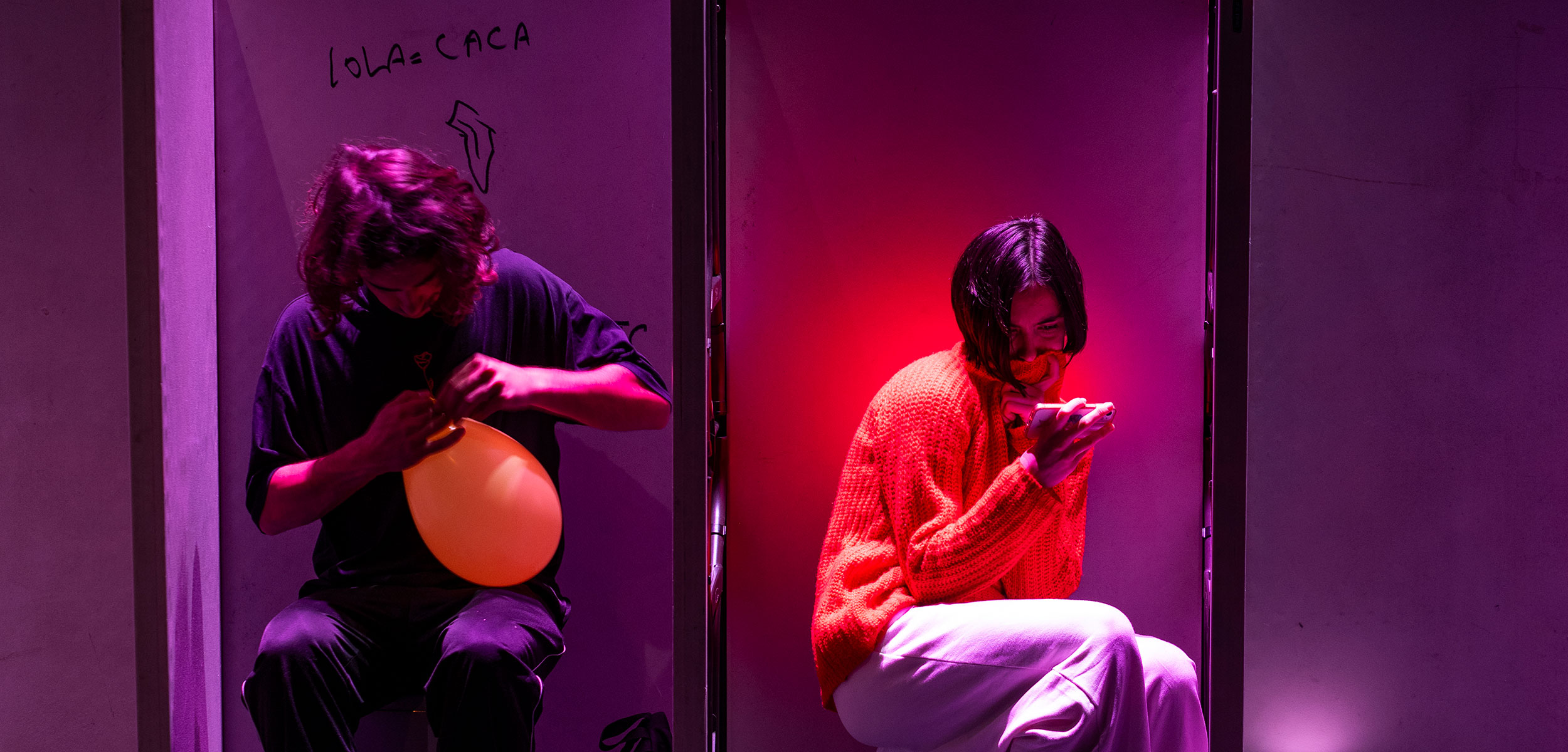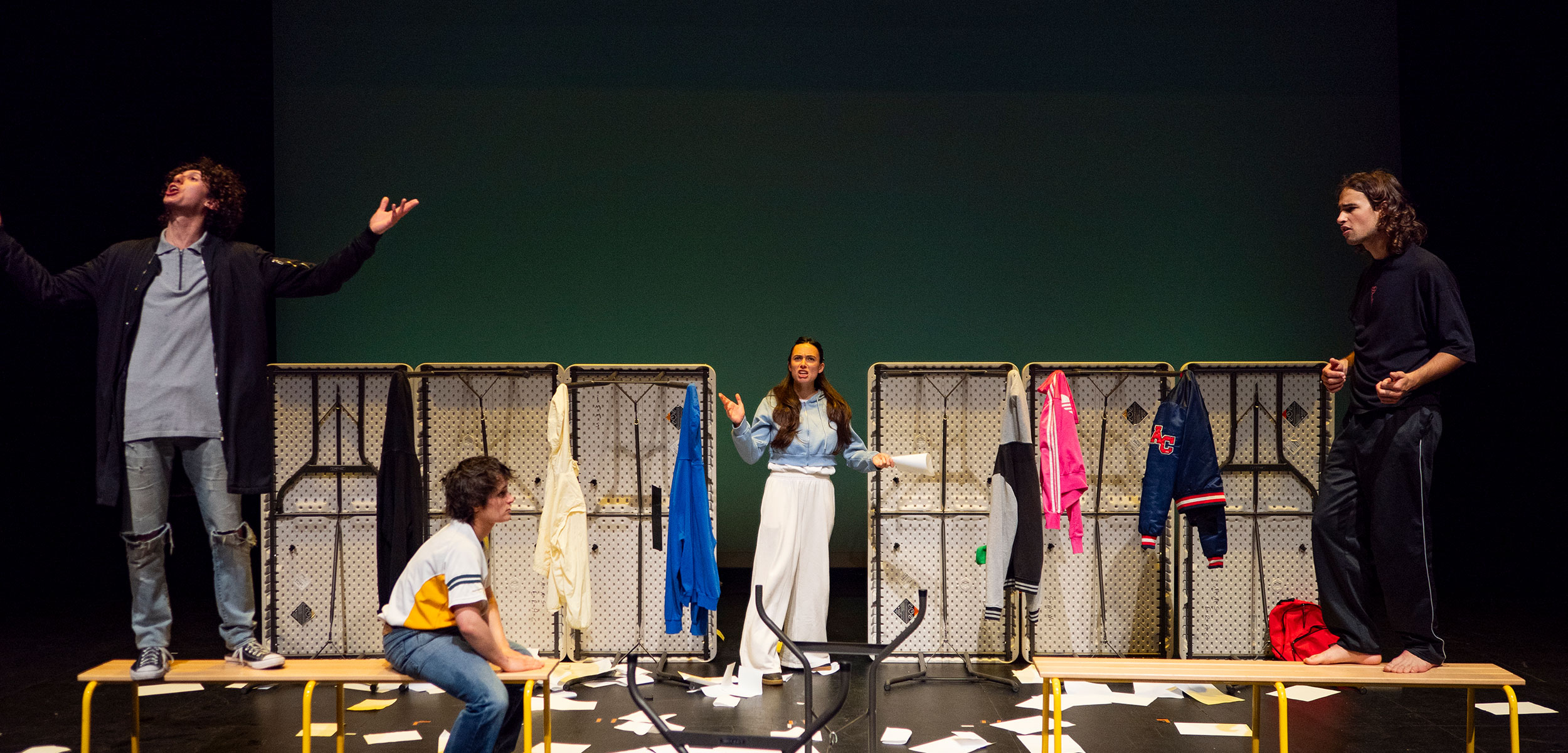 Le texte choisi par les étudiant·es de l’ERACM emprunte les codes des Teen Movies. Les personnages sont très définis, les dialogues rapides et énergiques. En guise de décor, 10 tables et 4 bancs agencés pour créer la cantine, les toilettes, les vestiaires, la cour, avec toute l’inventivité et la créativité des enfants qui jouent au Lego.