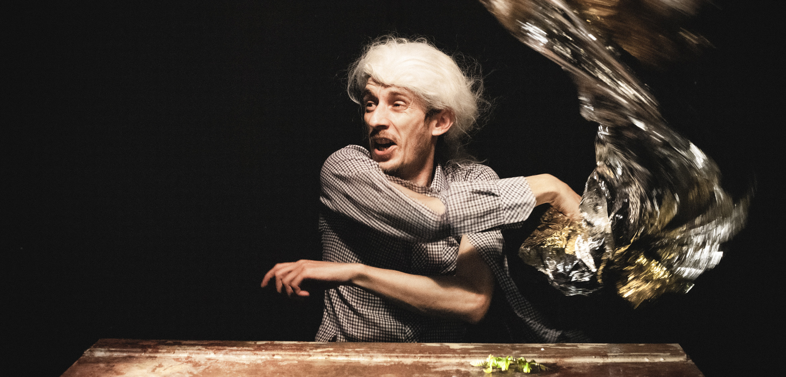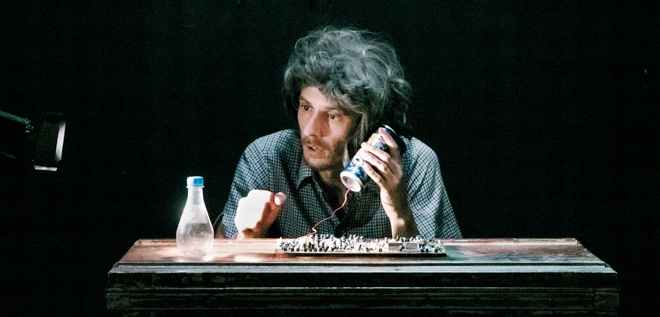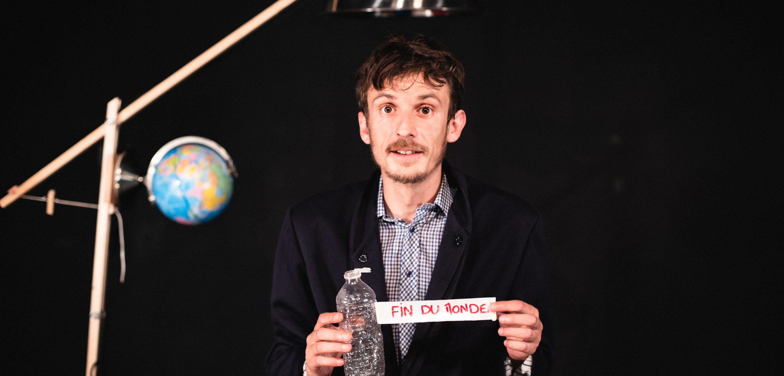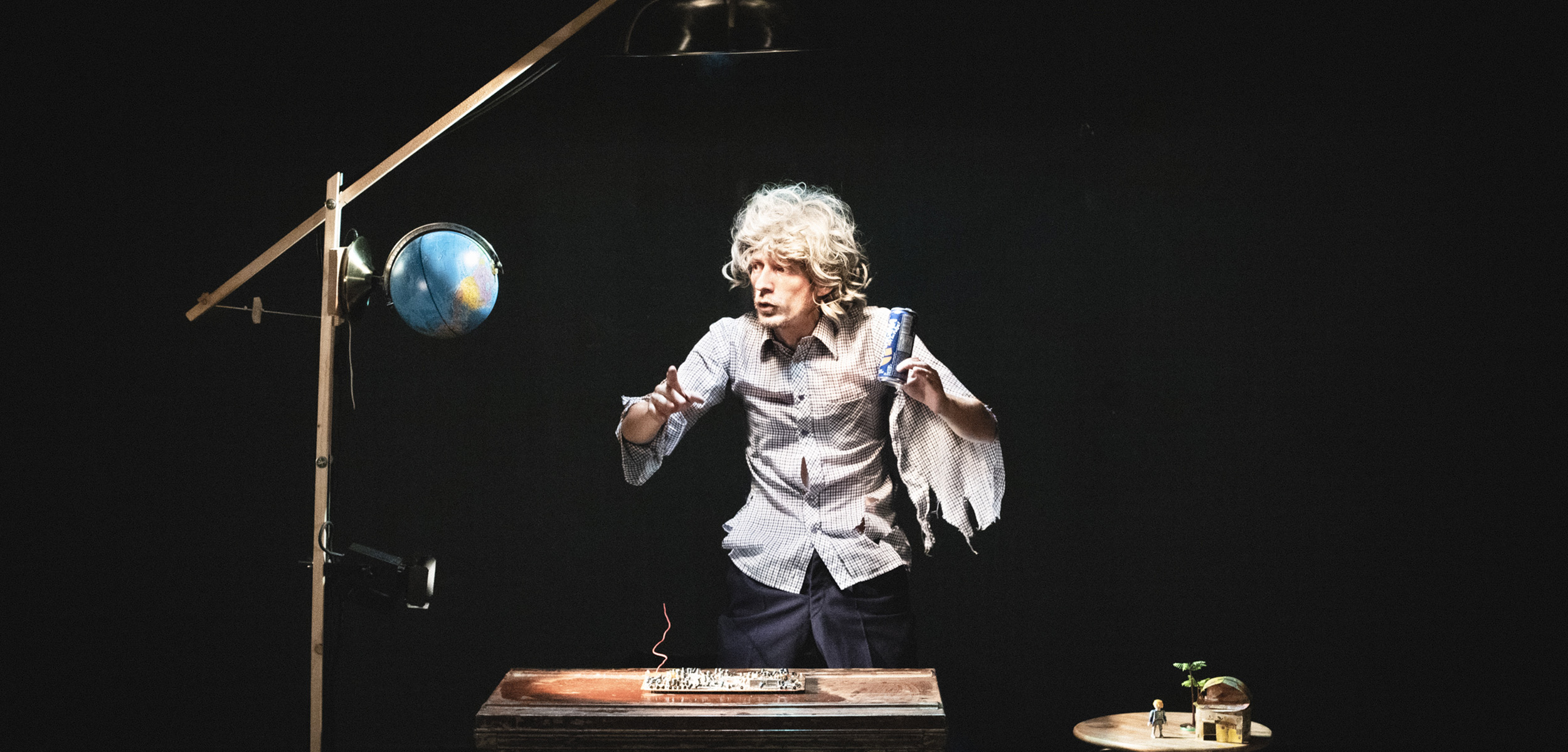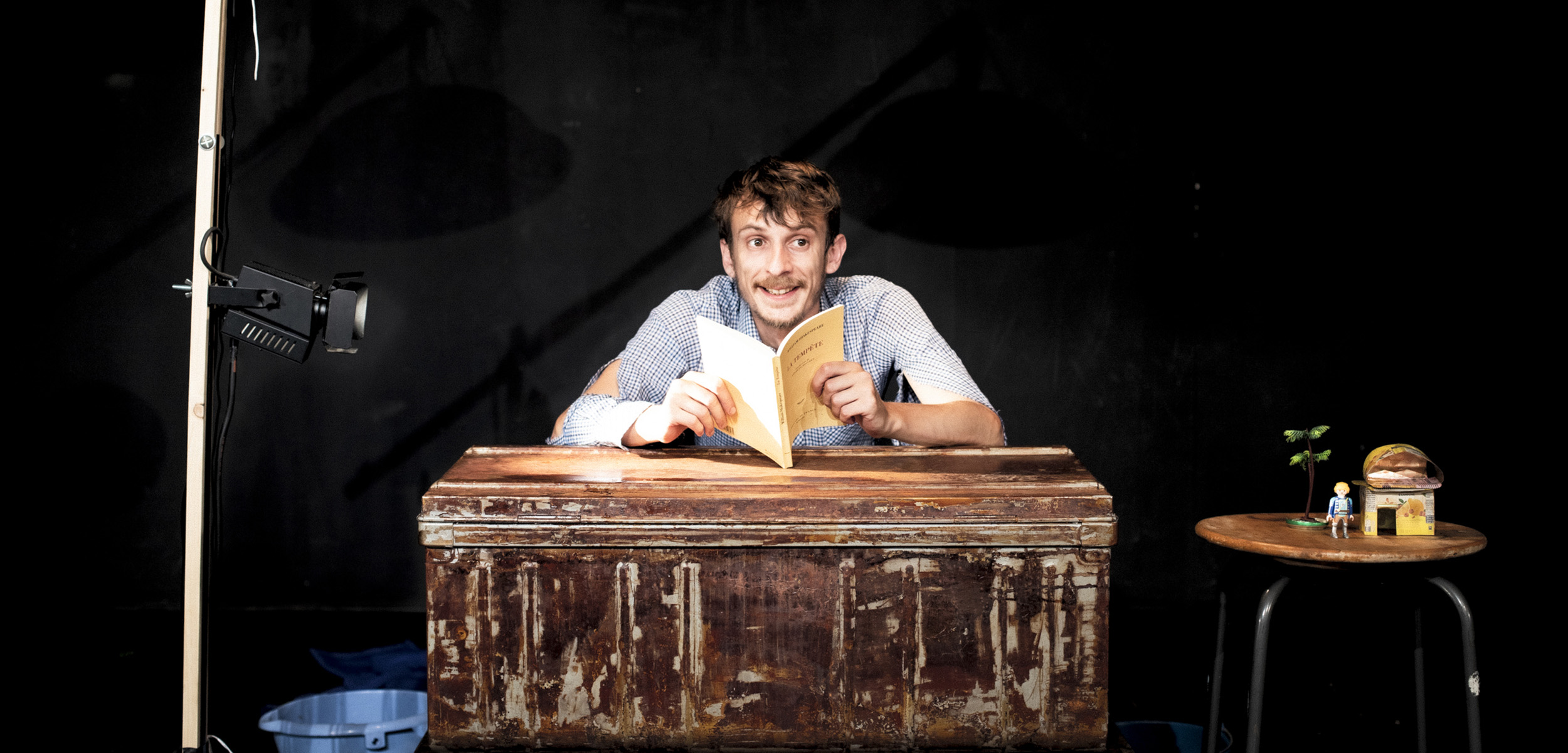 Sur scène, deux malles patinées par le temps, un tabouret abîmé, des bouteilles en plastique, des canettes de soda, de vieux circuits électriques et des verres d’eau où de terribles tempêtes se déchaînent. Le conférencier explore ces objets-rebuts, objets échoués sur son île après la tempête, ceux qui resteront après la fin du monde. Sous ses apparences de comédie légère et enlevée, La Tempête est le récit d’un homme oublié du monde, en exil après que celui-ci se soit effondré.