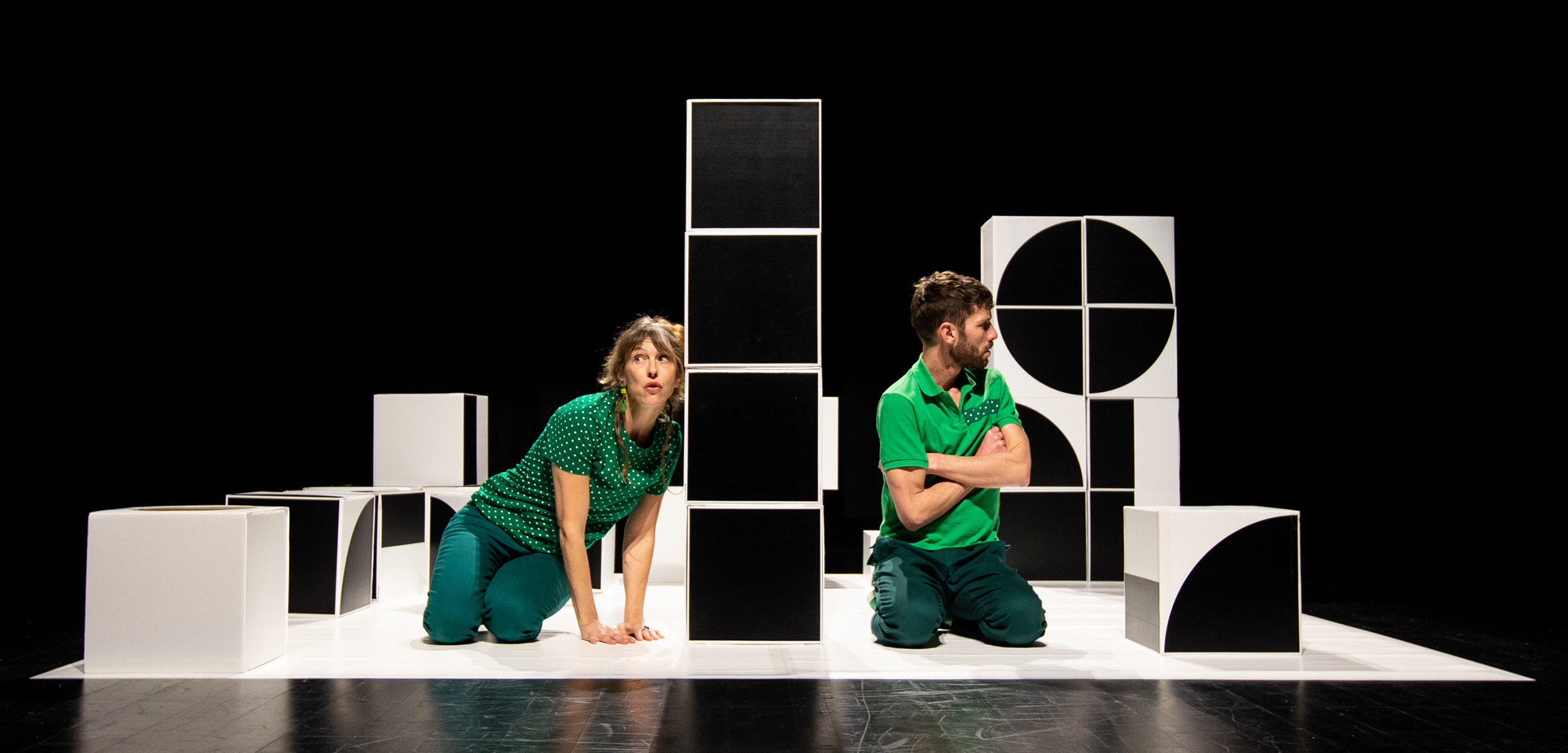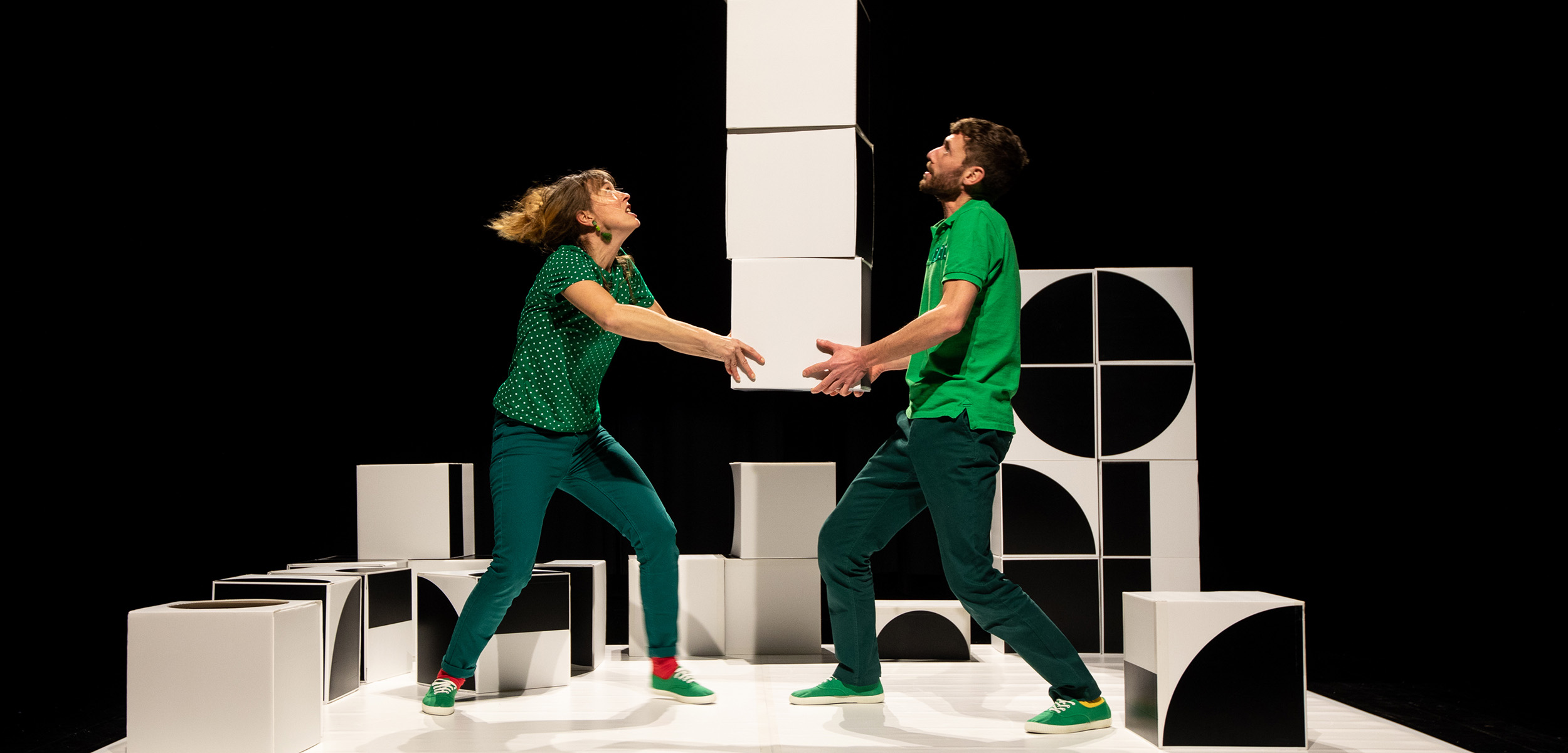 L’univers visuel composé par Vincent Mathy, illustrateur, laisse libre cours à l’imaginaire. Sur les cubes blancs, quatre formes élémentaires s’associent au hasard des constructions. Les mots s’assemblent eux aussi pour recréer la musicalité d’une langue. Doux, rapeux, inventés ou étrangers, ils aiguisent notre curiosité.