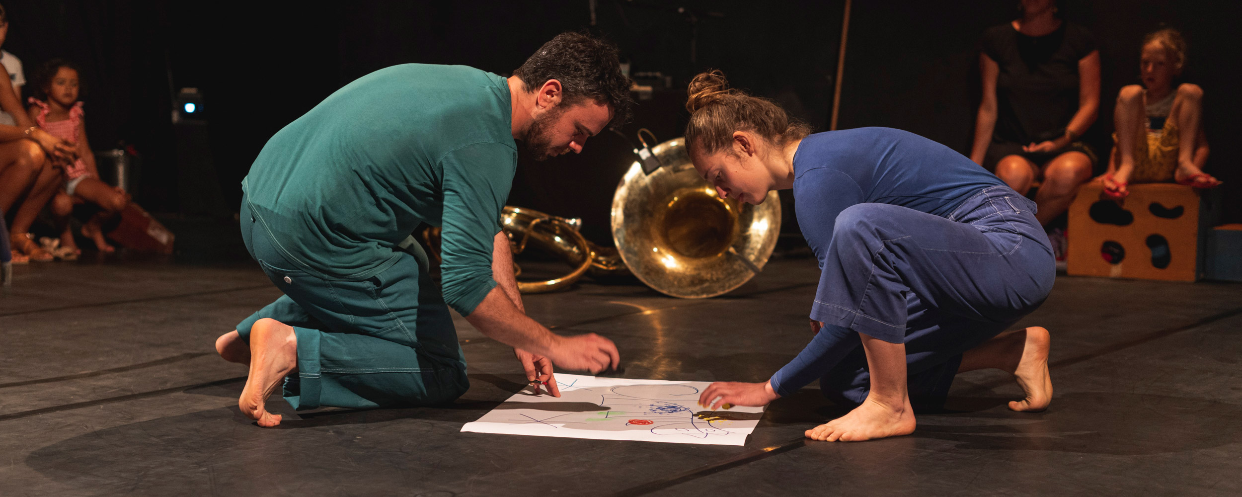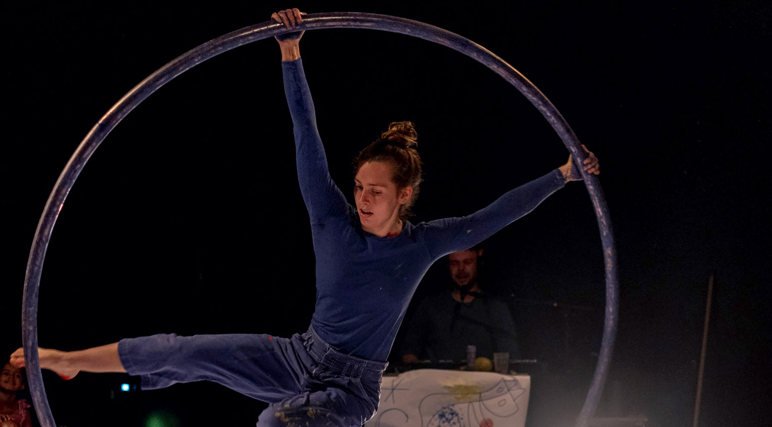 Une circassienne à la roue Cyr et un musicien au trombone et au soubassophone questionnent le cercle et le cirque. Sous l’action de l’agrès, formes et couleurs jaillissent. Au rythme de la musique, le mouvement circassien s’écrit, se dessine. Dans ce cirque graphique, inspiré par les œuvres des peintres Joan Miró et Vassili Kandinsky, la roue Cyr a quelque chose d’hypnotique.