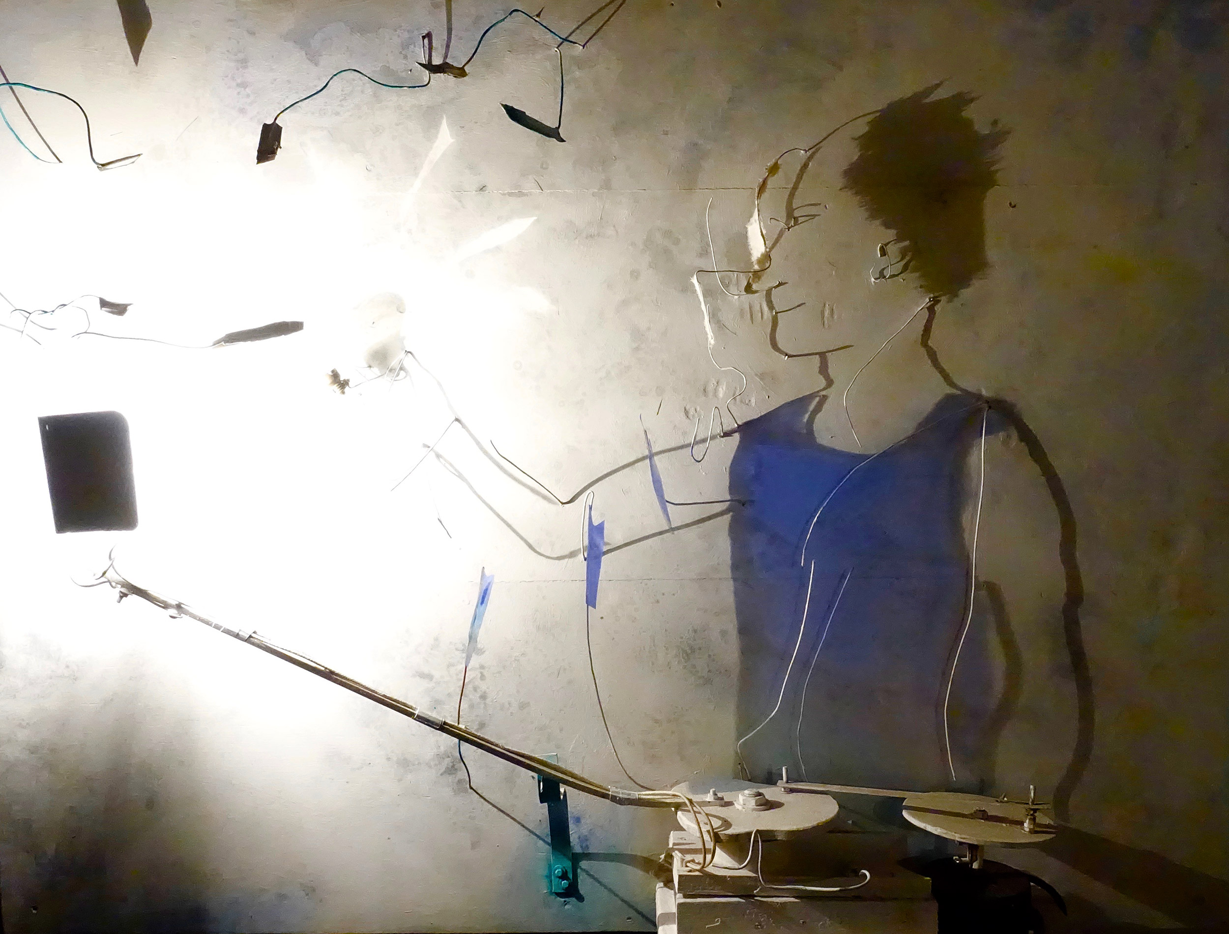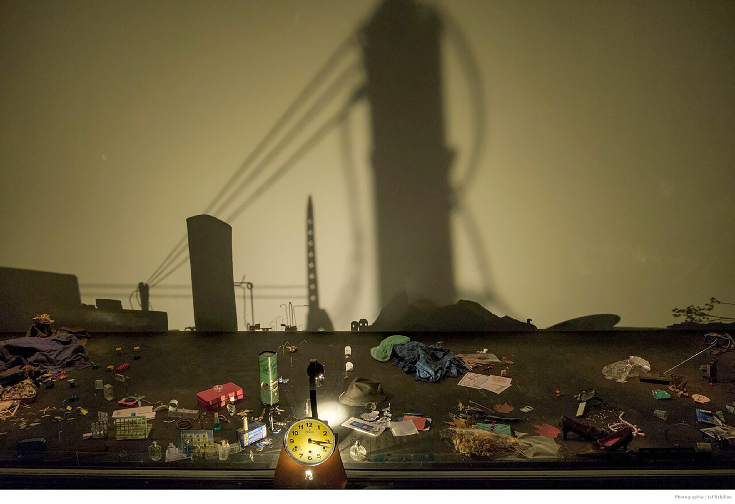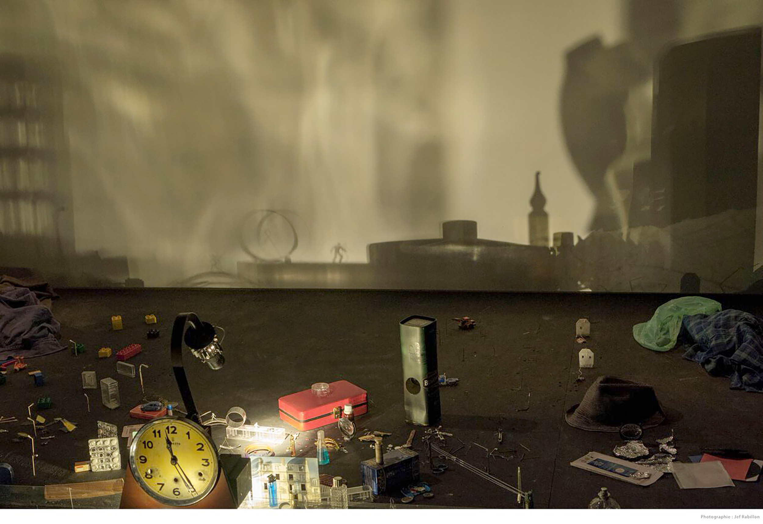 Selon la vitesse de la lumière, nous passons de l'étourdissement, de l'abstraction à la contemplation d'un paysage éphémère défilant sous nos yeux. Selon où notre regard se pose, sur la radiographie murale ou sur les objets épars de la scène, de multiples points de vue s’offrent à nous ; une multiplicité d’histoires se révèle dans notre intime chambre noire.