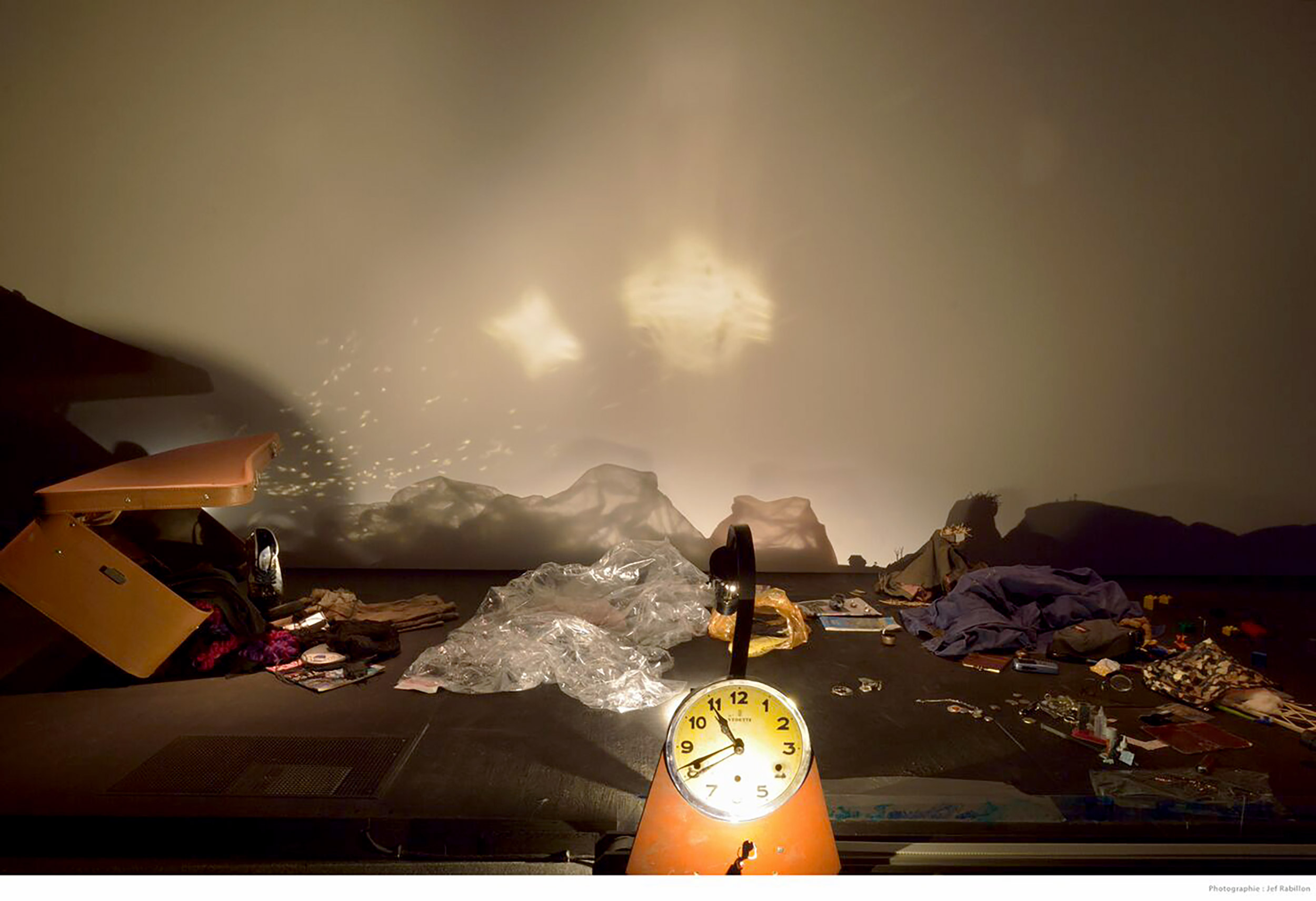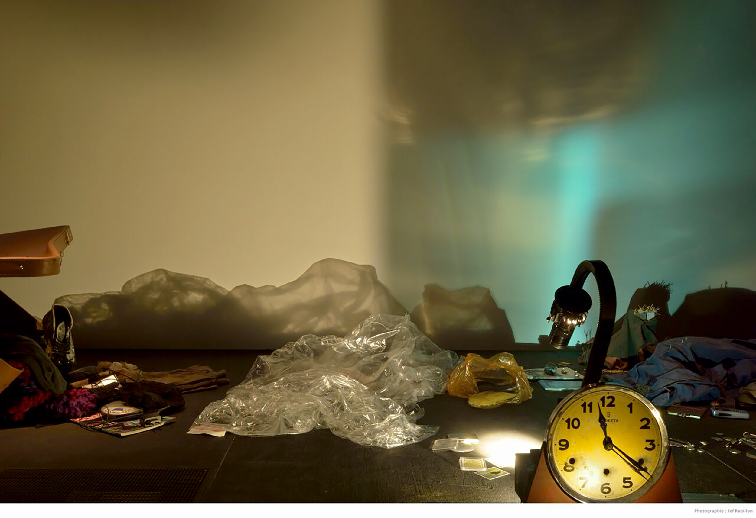 Sur un rail, deux ampoules, dans un va-et-vient intermittent, font apparaître sur le mur la “radiographie” poétique d'objets et de vêtements semblant s'être échappés d'une valise. Ombres, reflets, couleurs et transparences s'agencent en un grand tableau panoramique en mouvement qui témoigne d'un voyage.