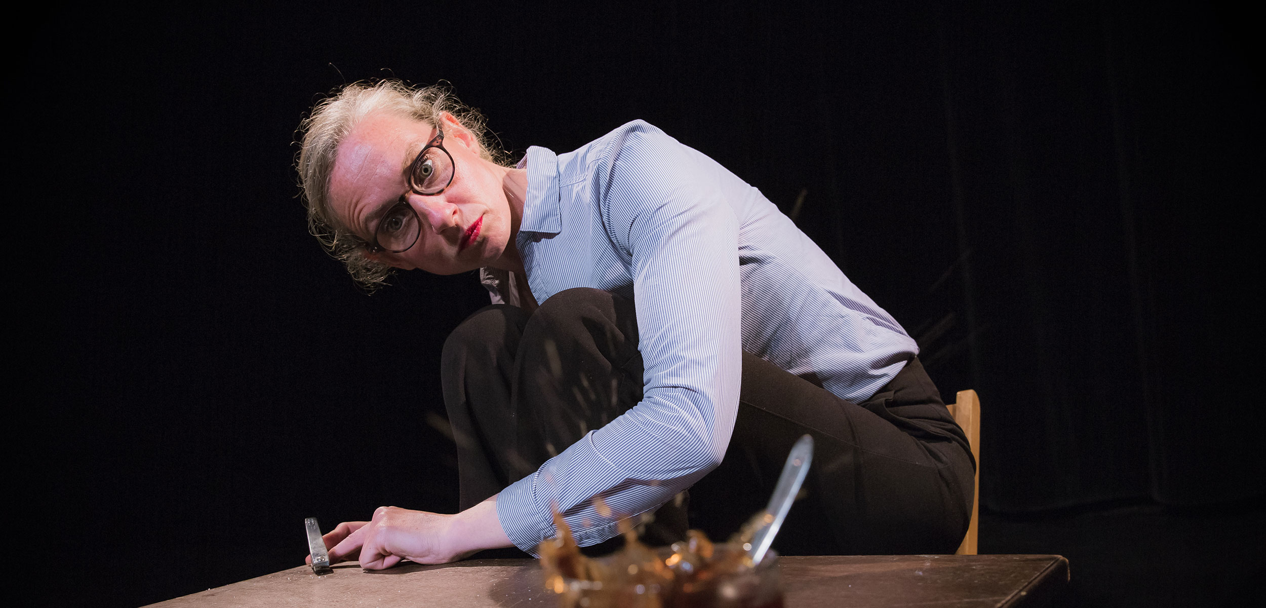 La cérémonie du thé débute avec délicatesse et précision. Les gestes de la protagoniste ritualisés au millimètre la grignotent peu à peu jusqu’à envahir tout l’espace. Pour chaque étape, elle invente des micro bricolages intriguants, complexifiant la préparation de son thé. Elle cherche à tout contrôler mais les accidents vont se succéder, transformant ou révélant la vraie nature du personnage. Dans ce spectacle sans parole, la tension monte et inévitablement, l’histoire dérape.